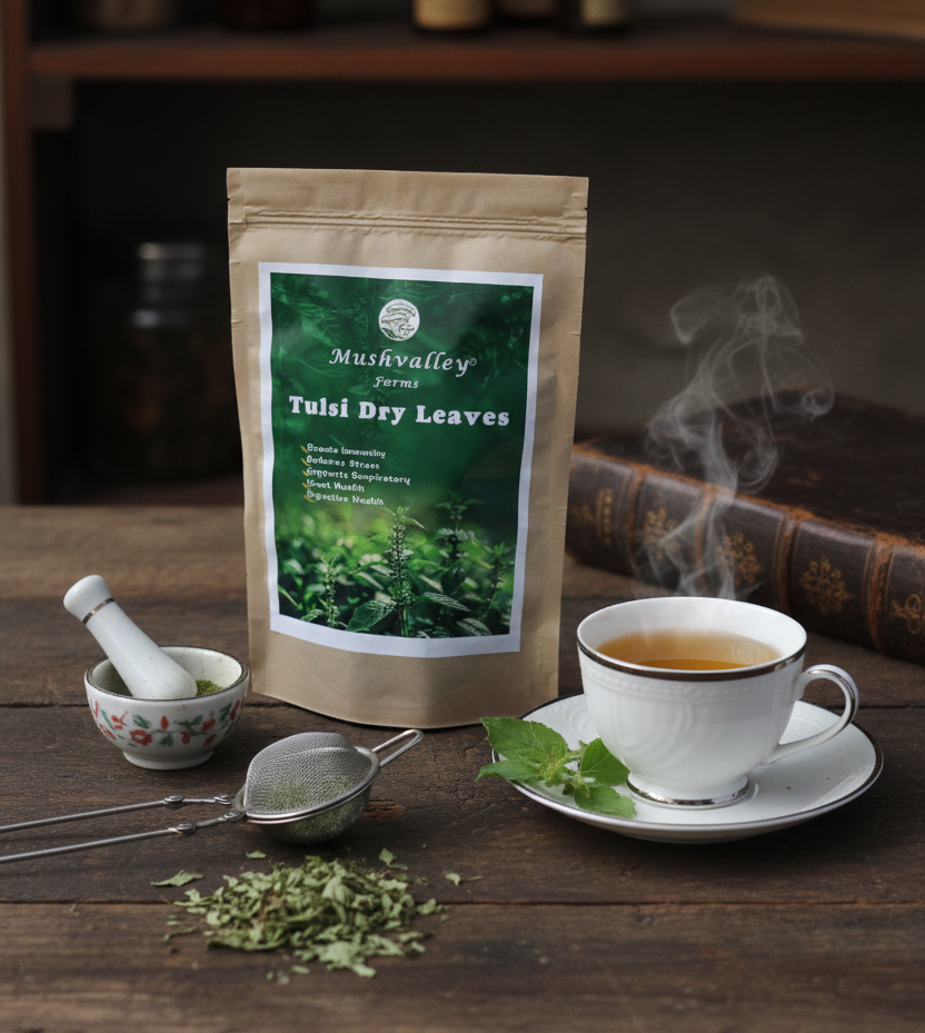Dry Tulsi Leaves from Mushvalley Farms are premium-quality, sun-dried sacred basil harvested at peak potency. Rich in antioxidants and adaptogenic compounds, these leaves support respiratory wellness, boost immunity, and promote mental clarity. Perfect for brewing aromatic teas, infusions, or culinary applications. Our carefully dried leaves retain their vibrant properties and distinctive flavor profile. Ideal for wellness enthusiasts seeking authentic, farm-sourced tulsi with proven traditional benefits.